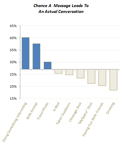 My takeaway is that women get more attention if they make eye contact and smile. Men get more attention if they look away and don't smile. The "MySpace shot" gets a lot of messages, but those tend to fail to lead to an actual conversation. The better strategy seems to be to use a photo where you're doing something interesting or with an animal.